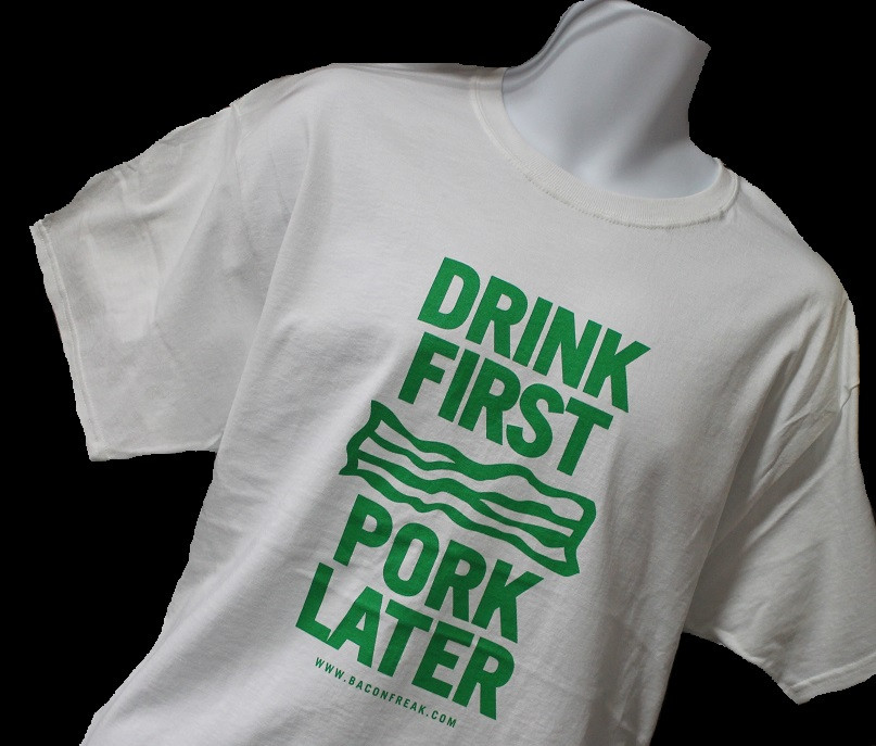 Show up to a party wearing a shirt that announces how you truly feel: Drink First, Pork Later. The bacon graphic in between those two phrases shows your true love for the ultimate meat candy. This apparel says it all. Get your drink on. And then... well... eat your bacon later. Uh... yeah. That's exactly what we mean. *Wink, wink.