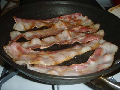 3) Heat up a frying pan. Pre-cook some bacon for about 3 minutes per side. Not too much – you don’t want to totally fry it, you just want to get it a little past raw. Raw is bad for taste as well as for your intestinal tract. The bacon should just be starting to brown and might be a little crispy.