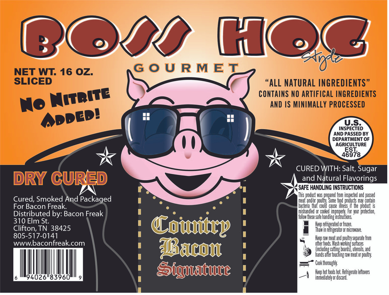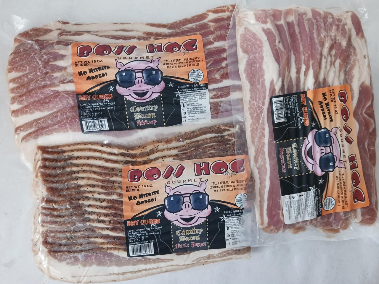 This bundle has one 16 oz. package each of our Boss Hog Hickory Smoked No Nitrate Bacon, our Boss Hog Signature Smoked and Boss Hog Signature Smoked Maple Peppered No Nitrate Bacon. The Signature smoke comes from a mixture of applewood, pecanwood and coffee beans for a rich smoky taste. Same great taste as our regular dry cured bacon, but without the added nitrates and nitrites. No water is added to this dry cured bacon, therefore it won't shrink or splatter when cooking. We have modified the cure process and there is a bit more moisture left in the bacon which also offers a slightly less salty flavor. These varieties are traditional favorites. Great for breakfast, on sandwiches and great in almost any recipe.