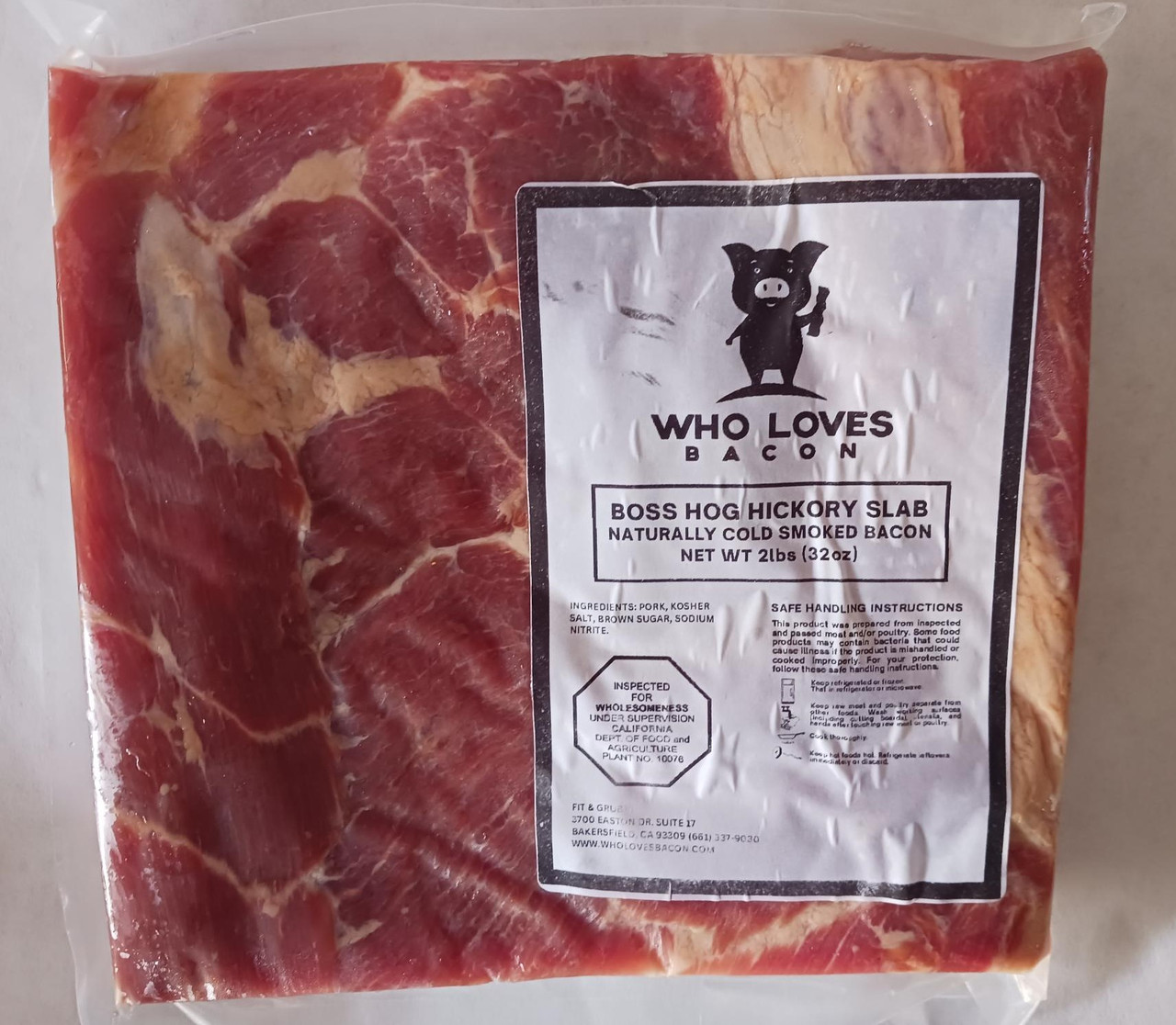 Brought to you from our Bacon Freak Slab-oratory! With this uncut, slab bacon, you're the one who decides just how thick or thin your slices will be. This Boss Hog hickory smoked slab bacon is dry sugar cured, so this bacon will not shrink like packing house bacon because no water is added or used in the curing process. We use a time-honored, secret formula and you can certainly tell the difference in taste. No water means no splatter, which is why Bacon Freak bacon is the only bacon you can fry naked! This slab bacon boasts a delicious rich and smoky flavor. Our new dry cure process leaves a bit more moisture in the belly than before and has a less salty taste. So, grab a pack, and slice and dice this bad boy up any way you like. Each order contains one 2-pound uncut bacon slab.