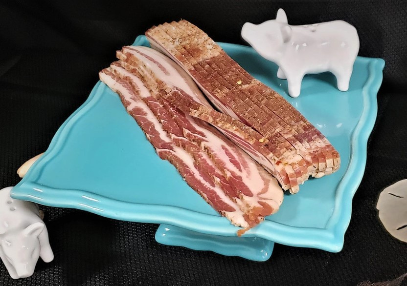 Jamacon Smoked Bacon starts with America-grown, USDA processed pork belly. The belly is hand rubbed in a blend of Kosher salt and brown sugar as well as a Jamaica Jerk spice blend and spends seven to ten days for the flavor to soak in.  This gourmet Bacon offers a sweet and savory spice blend married to that smoky bacon flavor.